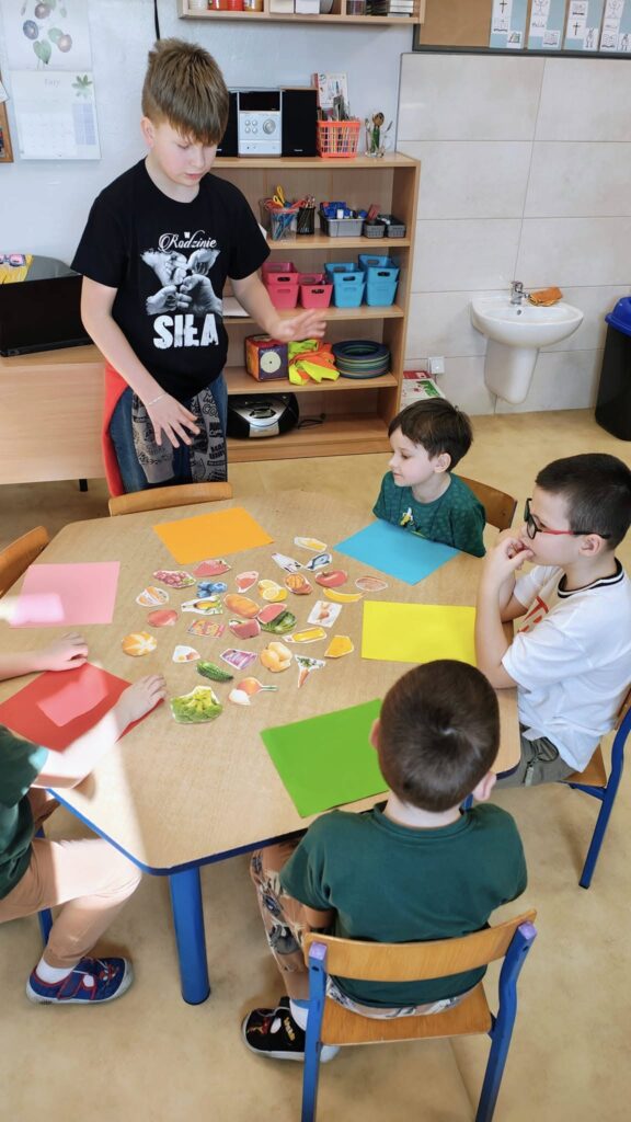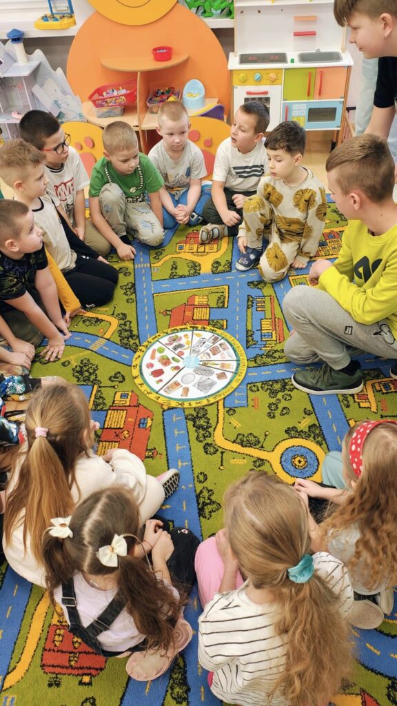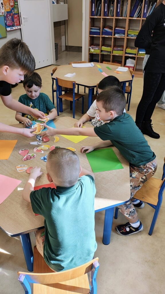 Dziś klasa szósta odwiedziła dwie grupy przedszkolne, by opowiedzieć im o zdrowym odżywianiu i przedstawić talerz zdrowia, który samodzielnie stworzyli na lekcjach wychowawczych z p. Magdaleną Perlińską w ramach projektu „Trzymaj Formę!”. Celem programu jest edukacja w zakresie trwałego kształtowania prozdrowotnych nawyków wśród młodzieży szkolnej poprzez promocję zasad aktywnego stylu życia i zbilansowanej diety,