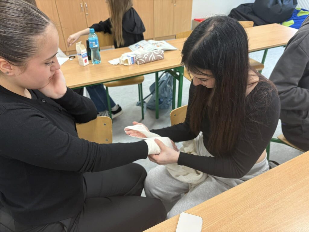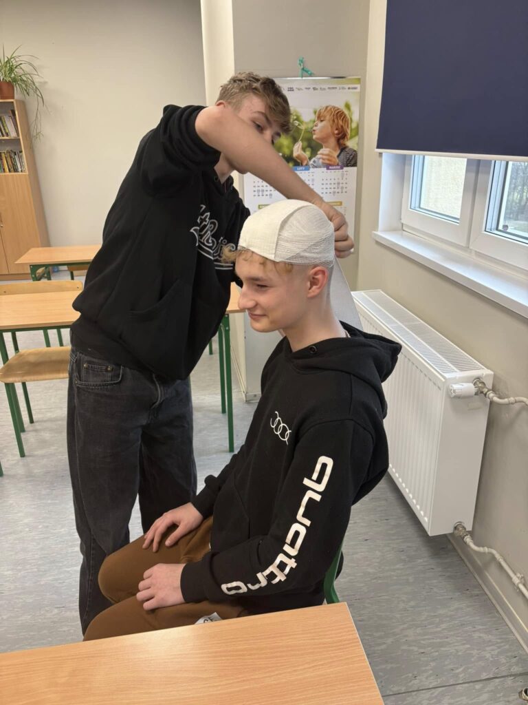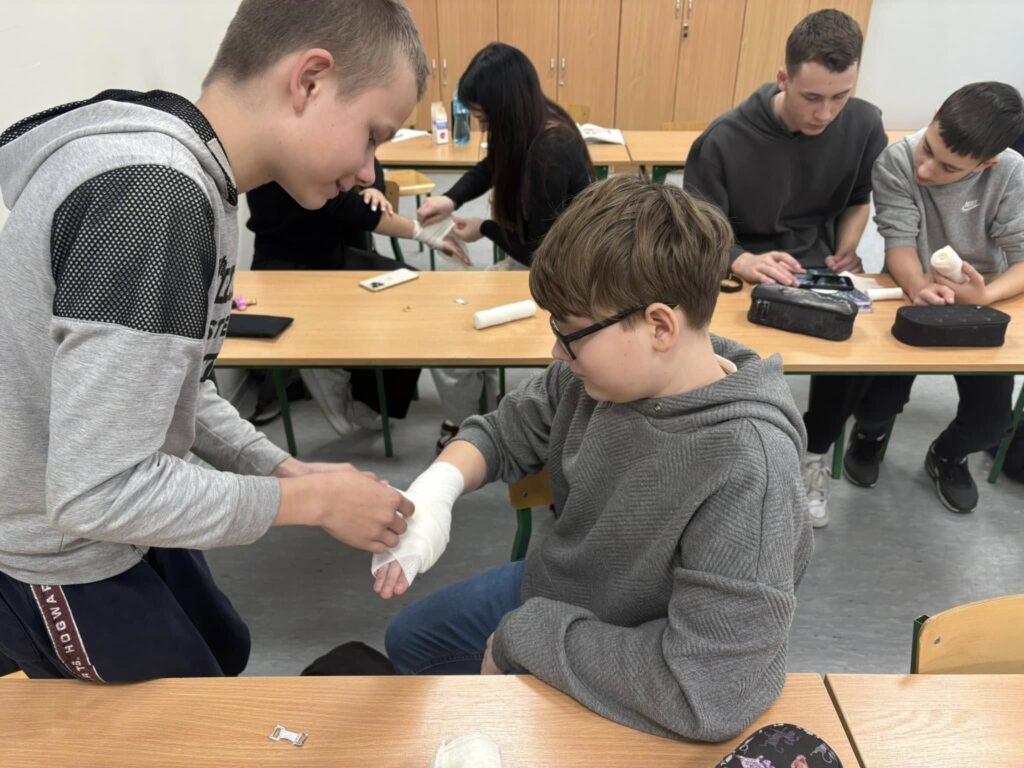 Na dzisiejszej lekcji Edukacji dla Bezpieczeństwa uczniowie doskonalili umiejętność bandażowania przy użyciu różnych technik. Ćwiczyli m.in. zakładanie opatrunków na kończyny, głowę oraz stawy, poznając sposoby tamowania krwotoków i unieruchamiania urazów. Zajęcia miały na celu rozwijanie praktycznych umiejętności udzielania pierwszej pomocy w sytuacjach zagrożenia zdrowia i życia.