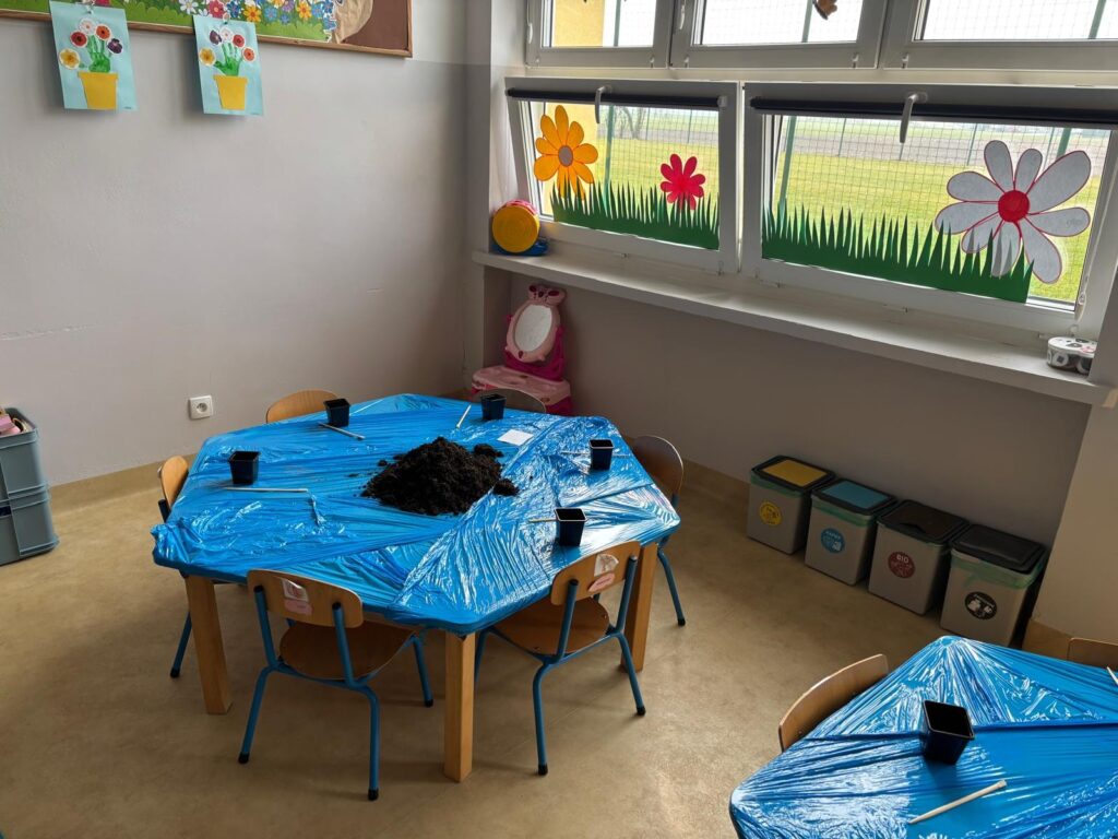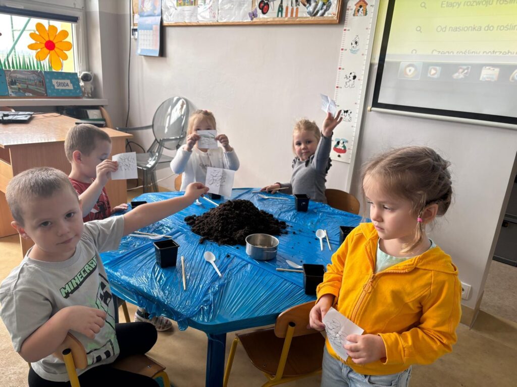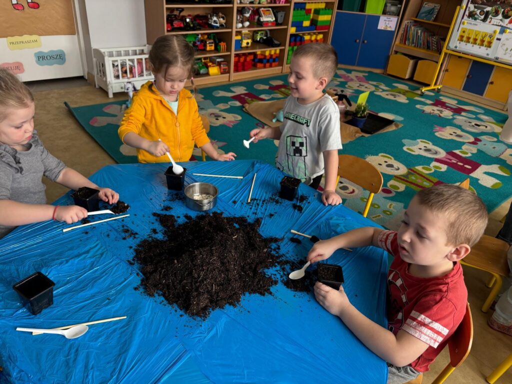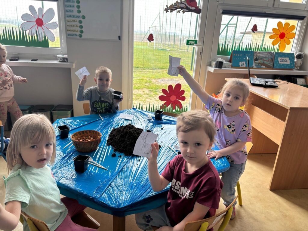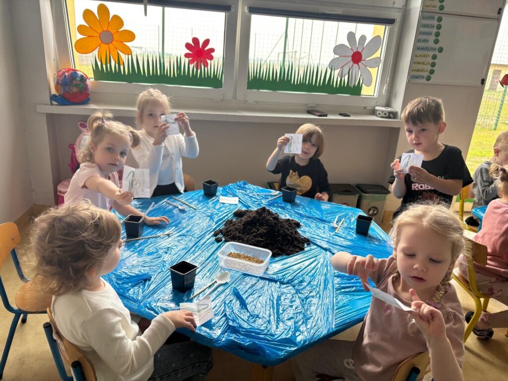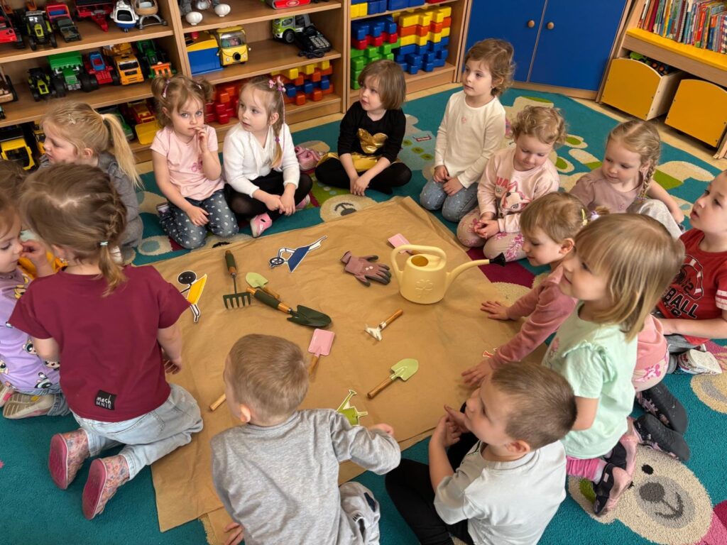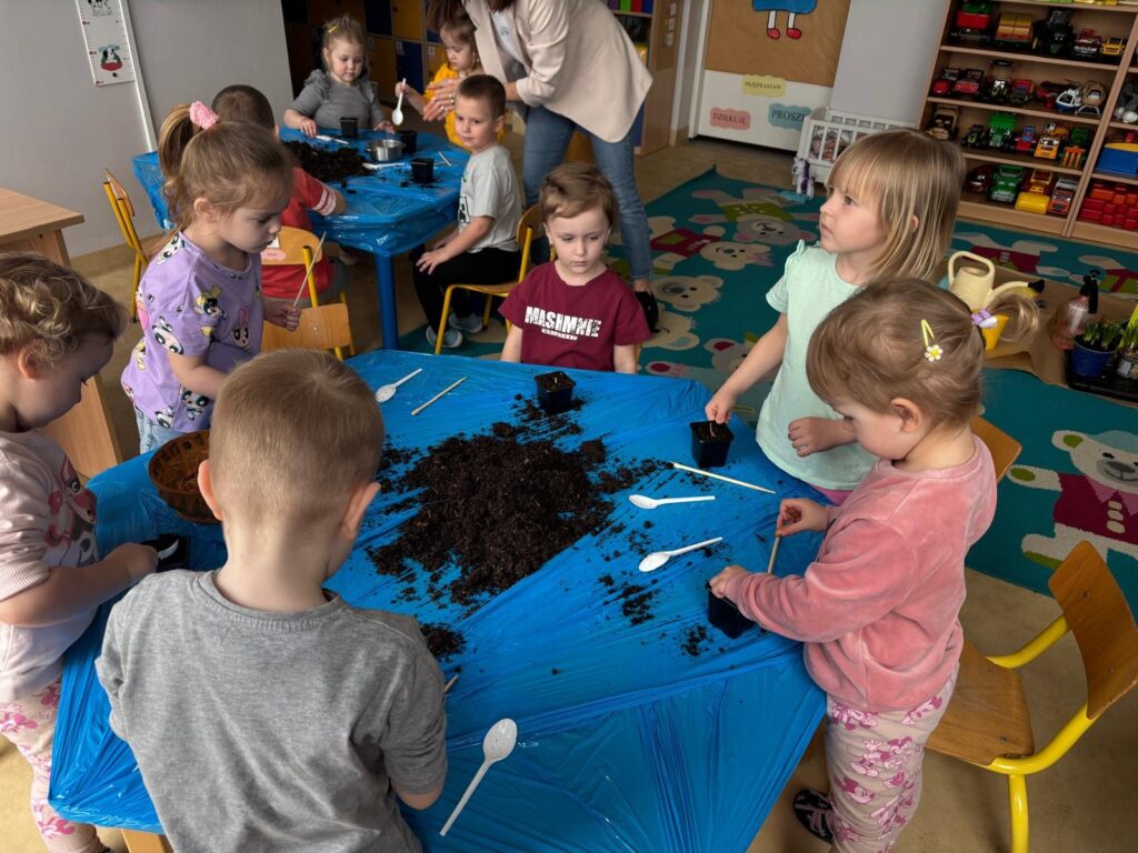 Przyszła wiosna i czas pracy w ogródku. Maluchy na zajęciach dowiedziały się co jest potrzebne do pracy w ogrodzie, co sadzimy i siejemy. Jak rozwijają się rośliny. Najfajniejsze zajęcia to takie kiedy sami możemy coś zrobić dlatego sadziliśmy cebulkę, sialiśmy owies i fasolkę ![]()