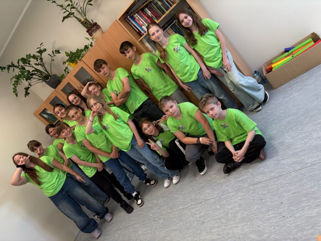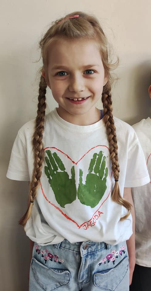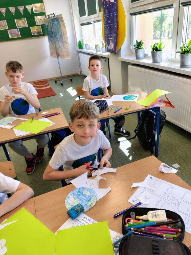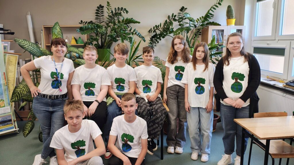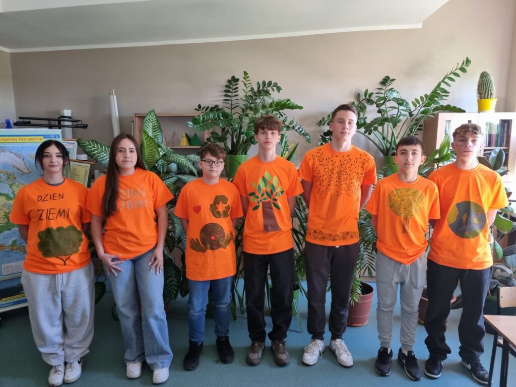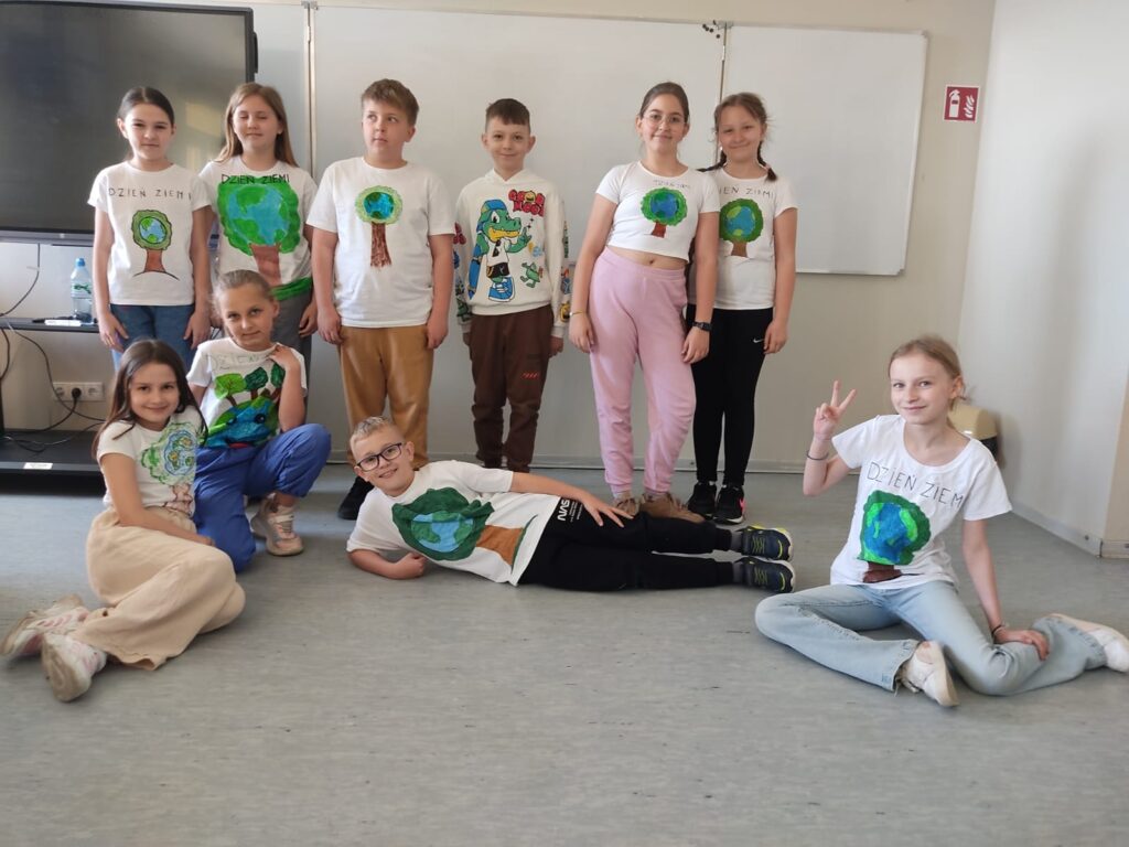 W ramach ekologicznego projektu zaprojektowali logo na koszulkach i z uśmiechem na twarzy zaprezentowali je na forum szkoły.