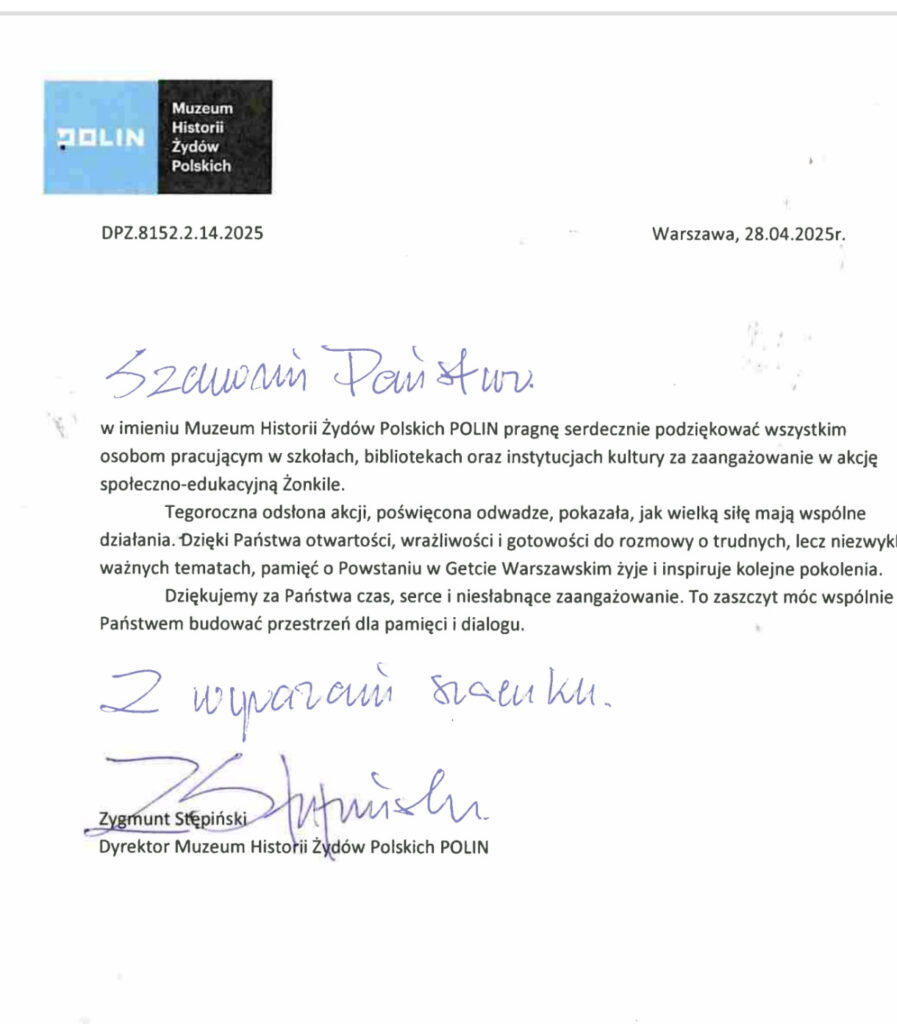 Miło nam poinformować, że nasza szkoła otrzymała podziękowanie za udział w tegorocznej akcji społeczno-edukacyjnej „Żonkile” organizowanej przez Muzeum Historii Żydów Polskich Polin.