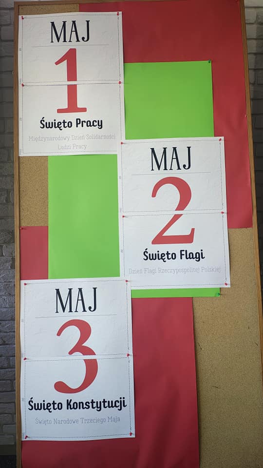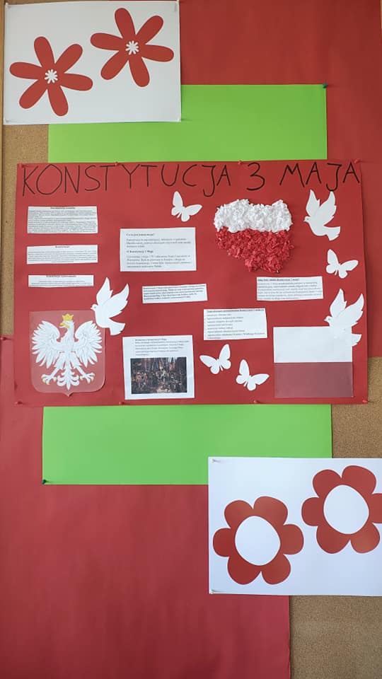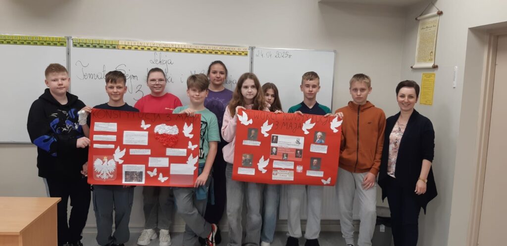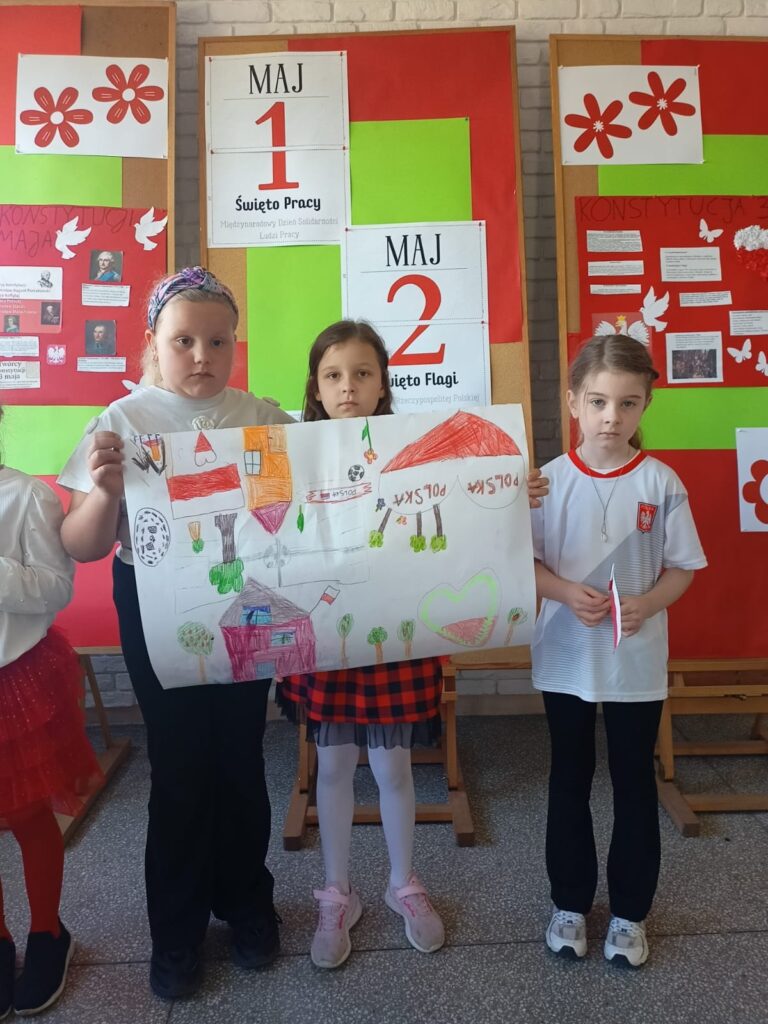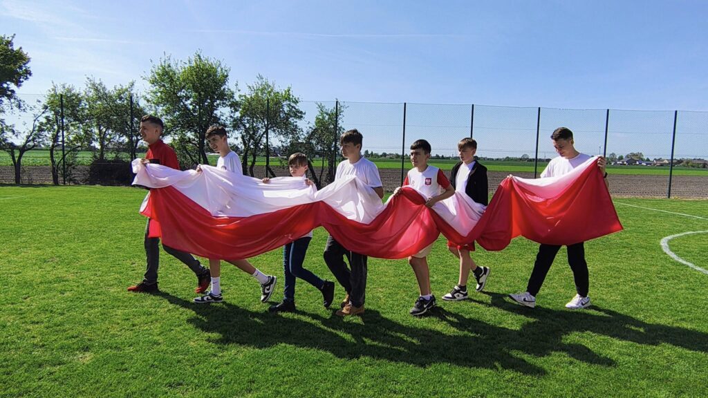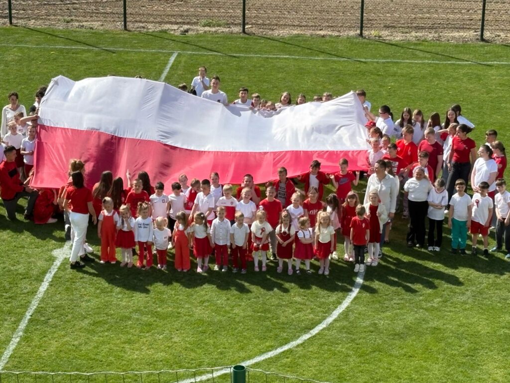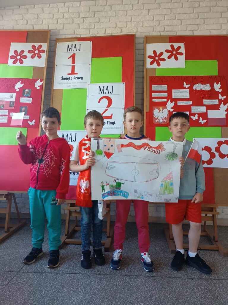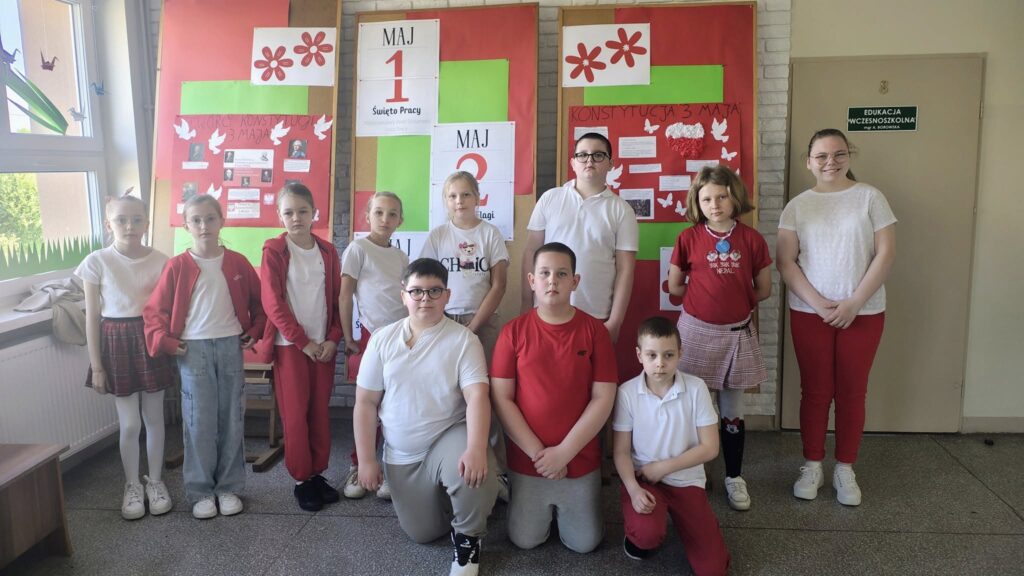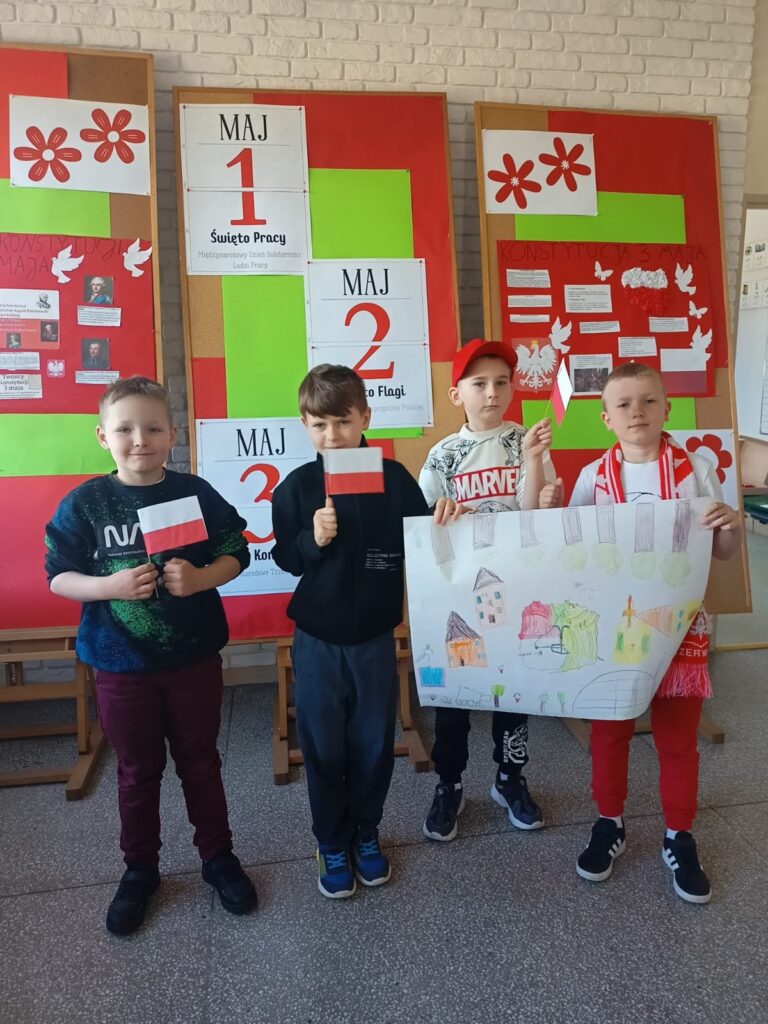 Z okazji zbliżających się Świąt Majowych nasi uczniowie przyszli dziś ubrani w biało-czerwone barwy, pokazując swoją patriotyczną postawę. Klasa VI przygotowała plakaty upamiętniające Konstytucję 3 Maja, które zostały wywieszone na gazetce, a młodsi uczniowie z zaangażowaniem malowali biało-czerwone flagi. Całość obchodów zwieńczył wspólny happening na boisku szkolnym z wielką flagą Polski. To był piękny dzień wspólnego świętowania i budowania tożsamości narodowej!