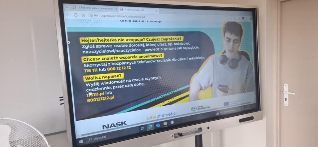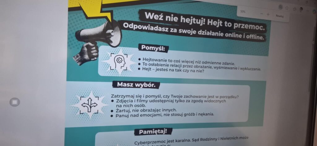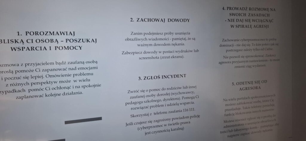 Przypomniano ścieżki uzyskania pomocy: wychowawca, psycholog i pedagog szkolny, nauczyciele, dyrekcja, policja a także rodzice lub inni zaufani dorośli. Zaznaczono obowiązek szybkiej interwencji wobec sprawcy – rozmowy naprawcze, jasno komunikowane konsekwencje