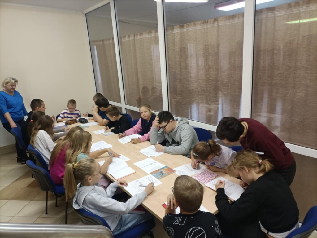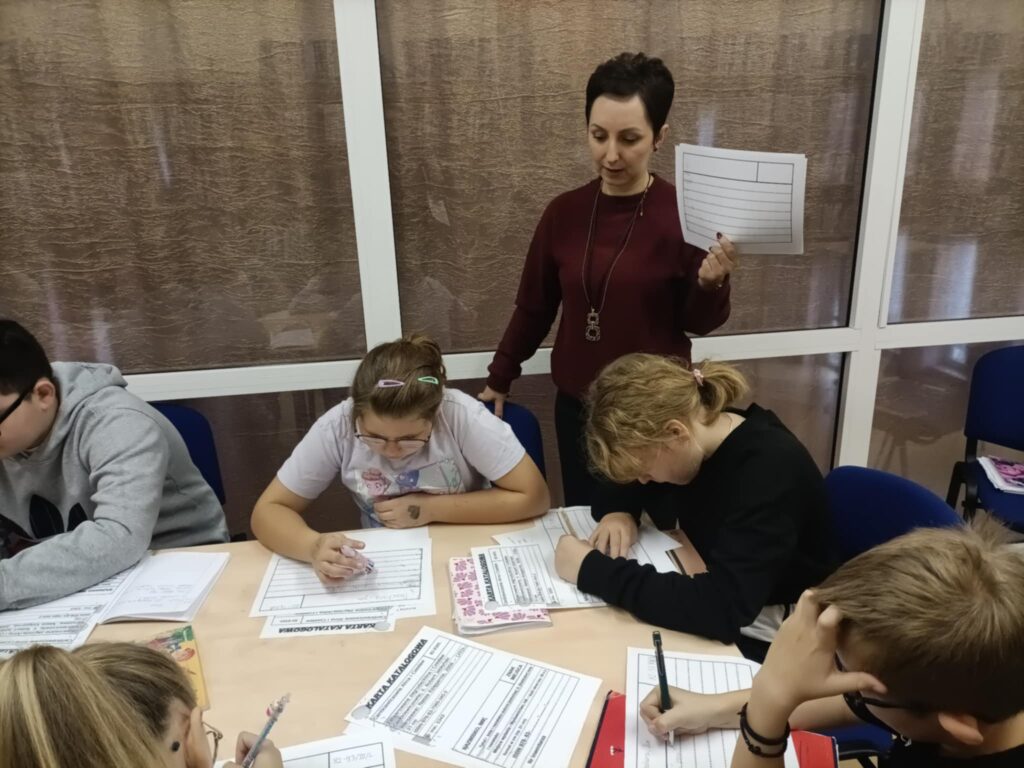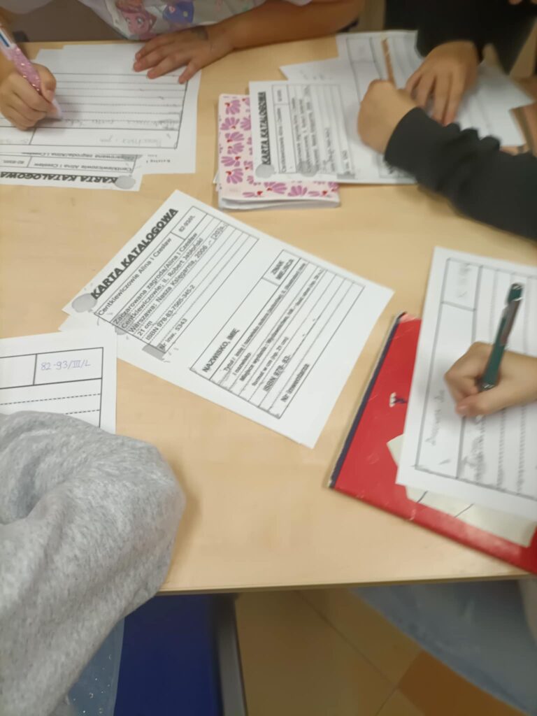 W kolejnej części spotkania czwartoklasiści wzięli udział w ćwiczeniach praktycznych – musieli stworzyć karty katalogowe dla lektury „Akademia pana Kleksa” Jana Brzechwy. Dzięki temu mogli przekonać się, jak w praktyce działa system katalogowy i jak przydatna jest znajomość sygnatur oraz zasad układu zbiorów w bibliotece.