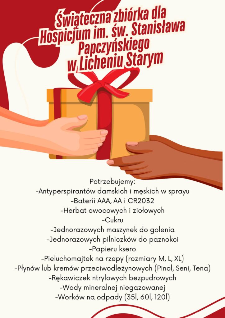 Kochani! Szkolne Koło Wolontariatu działające w naszej szkole uruchamia kolejną świąteczną zbiórkę. W tym roku wspieramy Hospicjum im. św. Stanisława Papczyńskiego w Licheniu. Osoby, które chciałyby wesprzeć zbiórkę prosimy o przynoszenie potrzebnych rzeczy do sali nr 17. Zbiórka potrwa do 15 grudnia 2025r.