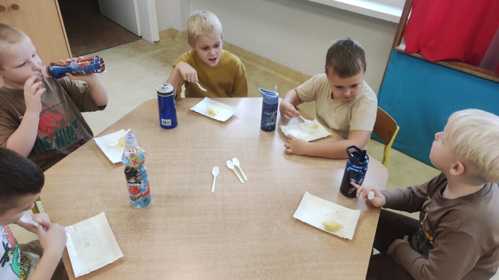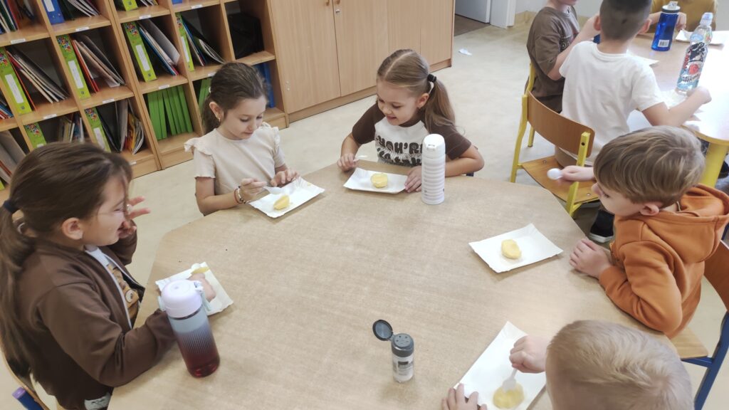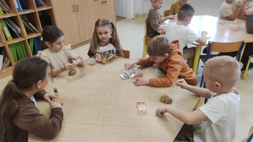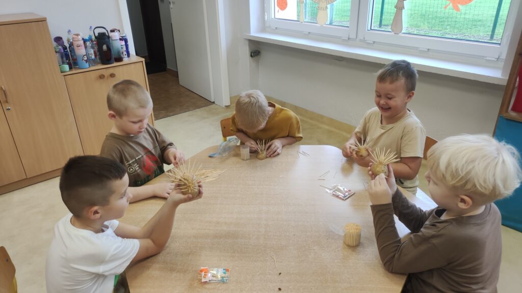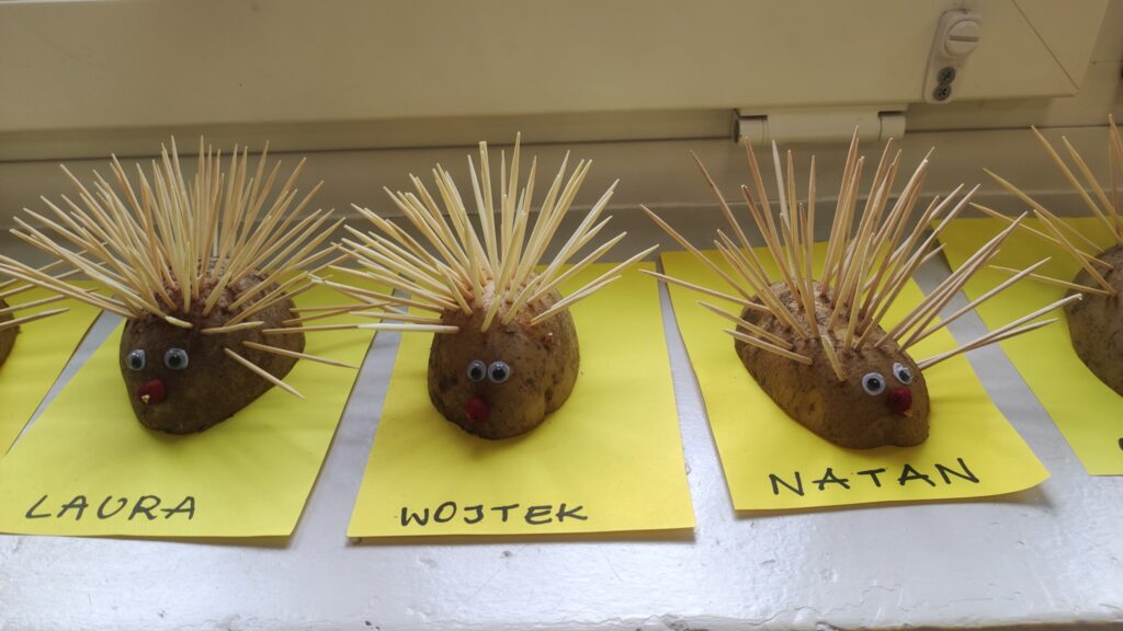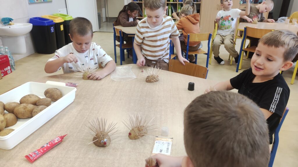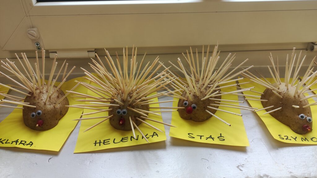to pyszne warzywo można jeść na różne sposoby. Przedszkolaki wybrały tradycyjną „pyrę z gzikiem”, były też ciekawe zabawy, a na koniec ziemniaczany jesienny jeż. ![]()