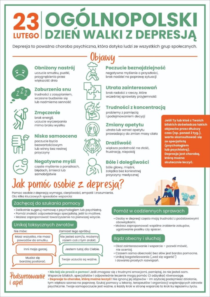Szanowni Państwo, Drodzy Uczniowie informujemy, że 23 lutego w czasie trwania ferii zimowych przypada Ogólnopolski Dzień Walki z Depresją.