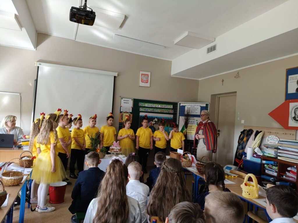 Dzieci zaprezentowały piękny program artystyczny – recytowały wierszyki i śpiewały piosenki, a z okazji występów przebrały się za urocze, żółte kurczaczki. Wyjątkowym punktem programu był występ muzyczny, podczas którego pierwszoklasiści zagrali na dzwonkach utwór pt. „Wyszły w pole kurki trzy”.