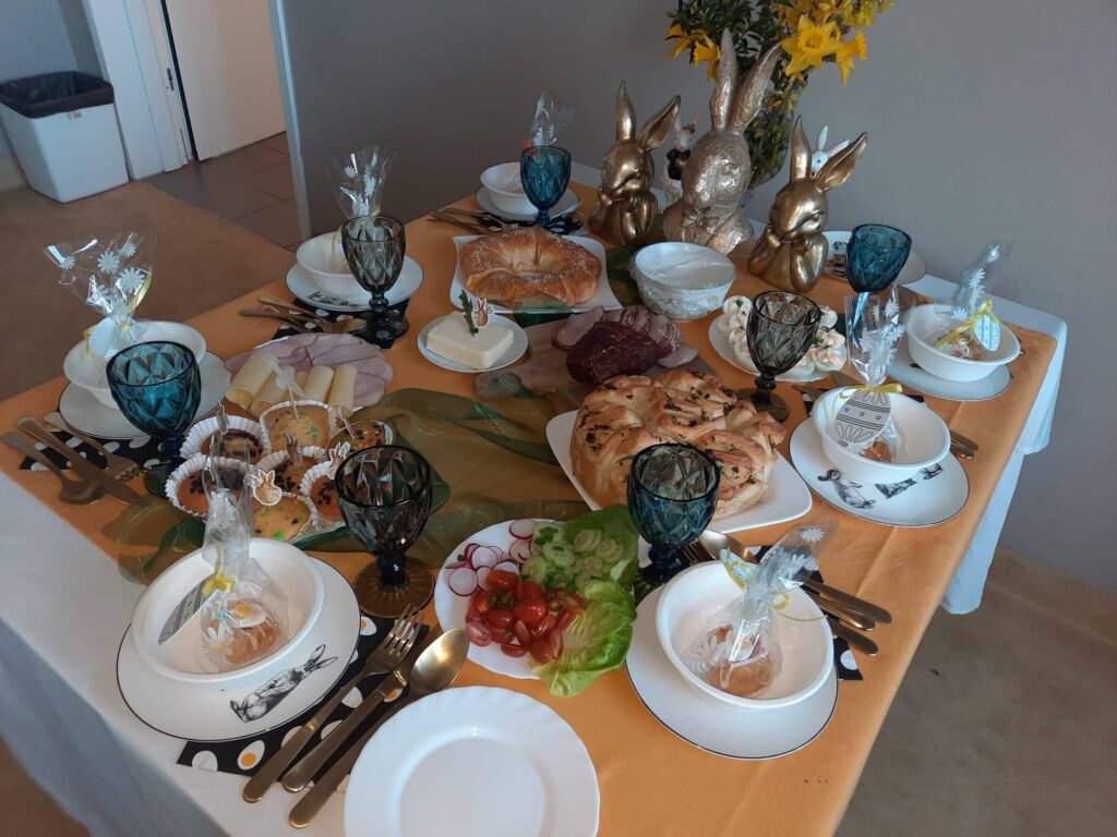 Następnie wszyscy zasiedli do wspólnego, uroczystego śniadania. Na świątecznym stole nie zabrakło tradycyjnych jajek, pysznych babek oraz innych wielkanocnych smakołyków.